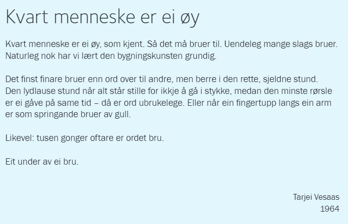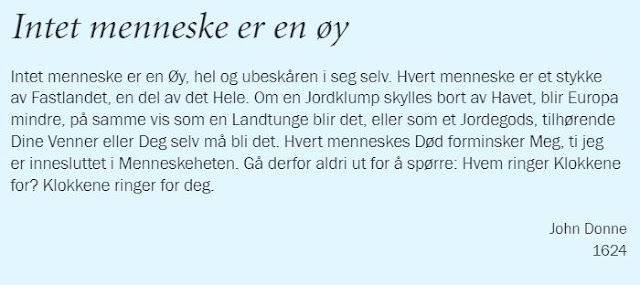 Vesaas digt står dog ikke alene, da det kan ses som et direkte modsvar på noget meget ældre, nemlig et digt fra den engelske barokdigter John Donne´s hånd, der i 1624 skrev digtet "Intet menneske er en ø" - og som i øvrigt inspirererde Ernest Hemmingway til at skrive "Hvem ringer klokkerne for... :