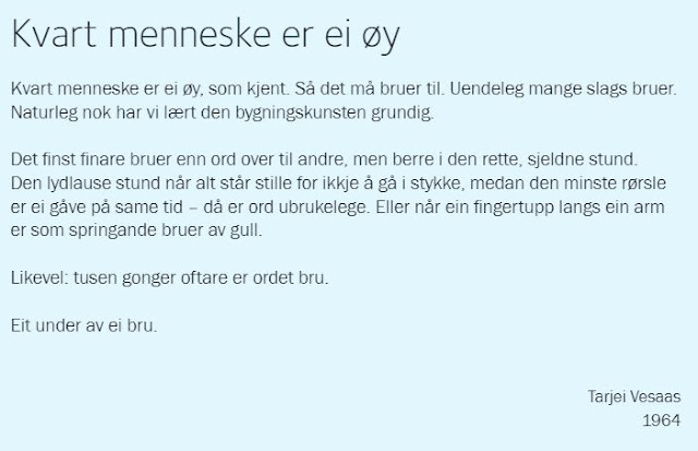 Nå, tilbage til SKAM. For hvad gør Vesaas digt så i serien? Er det blot lægens tilfældige omgang med stor historisk litteratur eller er der en dybere mening? Jeg læser det i direkte sammenhæng med scenen i SKAM - helt konkret som et skub til Isak om at gå ud og snakke med nogen om sin homoseksualitet, hvilket han jo også gør - han bygger en bro af ord (selvom ord ikke altid er den bedste bro, ifølge digtet) til sin bedste ven Jonas - og fortæller ham hvad han går og roder med - og det virker sørme.